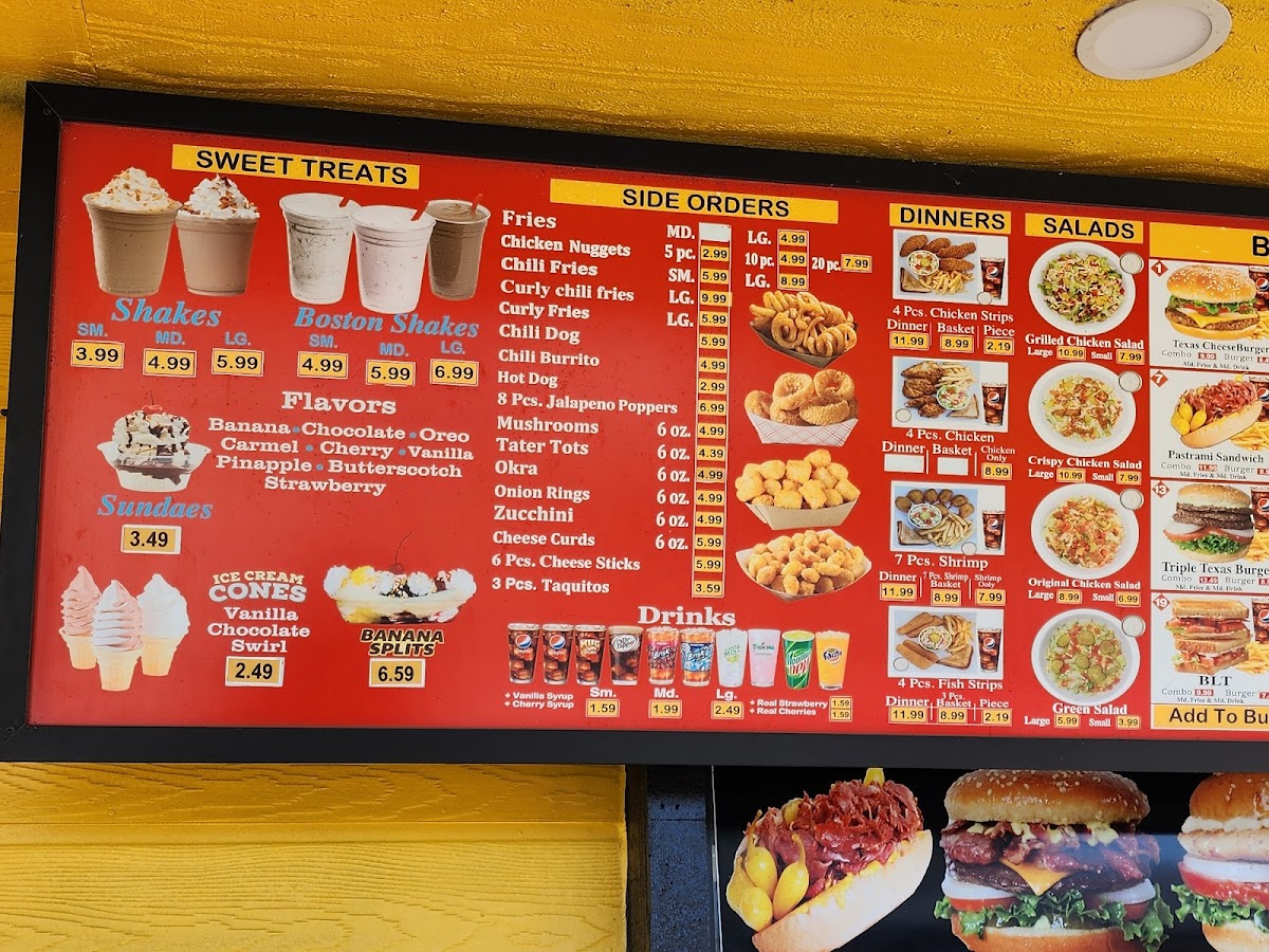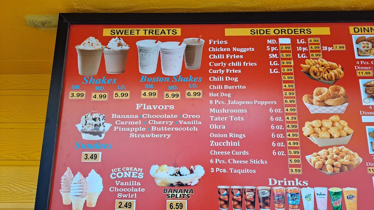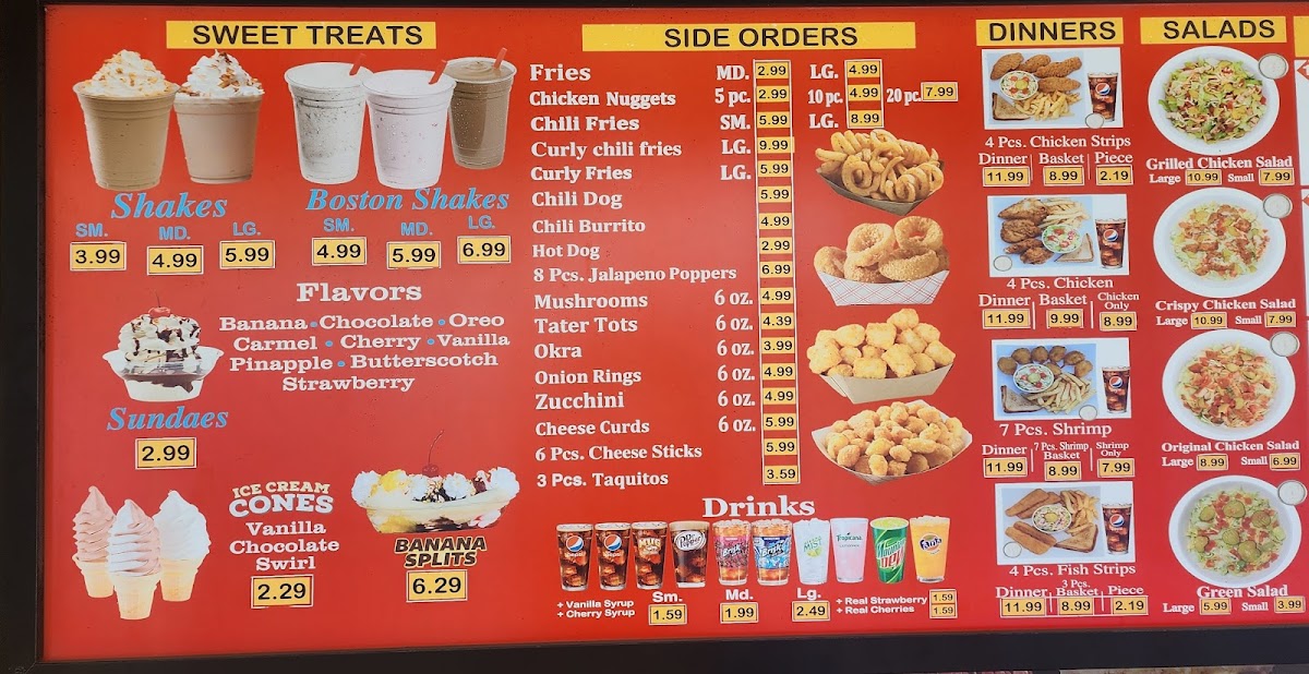Drinks and Shakes complement the food offerings, with selections such as the Boston Banana Milkshake available to accompany meals.