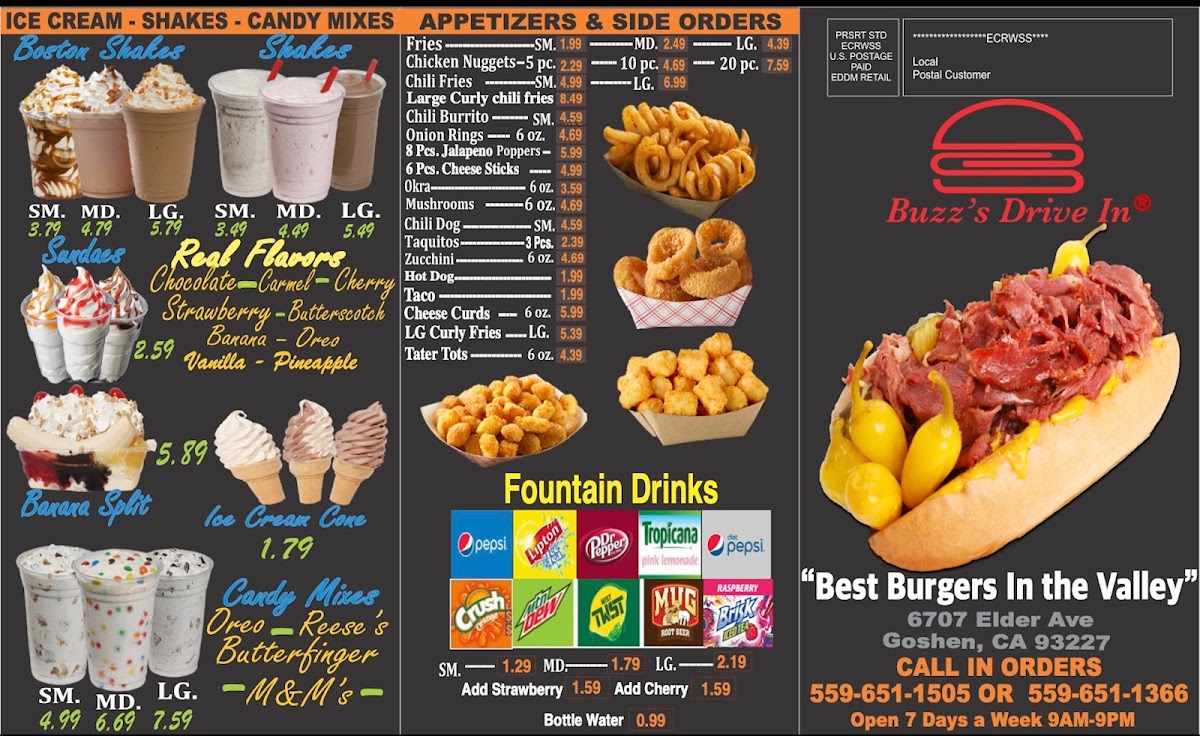 The menu at Buzz's Drive In offers a variety of fast food options with a focus on hamburgers and sandwiches. It is organized into several key groups including Combos, Burgers, Sandwiches, and Drinks. Customers can expect classic American fast food fare, suitable for quick meals and casual dining.